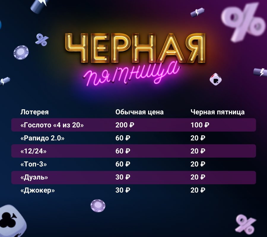 Черная пятница начинается в понедельник и продлится всю неделю! До 1 декабря мы снизили цены билетов сразу шести лотерей: «Гослото «4 из 20», «Рапидо 2.0», «12/24», «Топ-3», «Дуэль» и «Джокер». Чтобы вам было проще и быстрее купить лотереи по сниженной цене, мы сделали специальный пакет «Черная пятница», в котором — по одному билету каждой лотереи. Поехали!