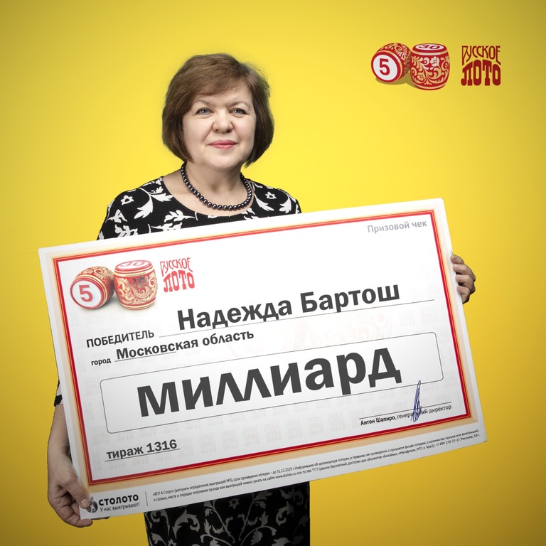 С первого дня 2020 года вся страна гадала, кем же окажется счастливчик, который выиграл в новогоднем тираже «Русского лото» миллиард рублей. Самый богатый победитель государственных лотерей объявился сразу после новогодних каникул, 9 января. Миллиардером оказалась жительница Подмосковья Надежда Бартош. Она приехала на оформление выигрыша в лотерейный центр «Столото» вместе с супругом и дочерью.