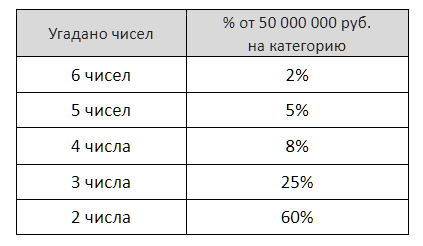 Фраза «Распределим 50 000 000 рублей между всеми победителями» означает, что в тираже «ВГЛ 5 Спорт» (алгоритм определения выигрышей № 2) 28.08.2020 в 22:30 мск между победителями будет распределена указанная сумма, если до тиража и в этом тираже не будет победителей в 1-й категории.
