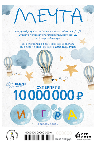 Благотворительный фонд «Подарок ангелу» помогает детям с церебральным параличом. А «Столото» уже второй год поддерживает фонд в этом добром деле. Один из его проектов, о котором мы хотим сегодня вам рассказать, — «Доброшрифт».