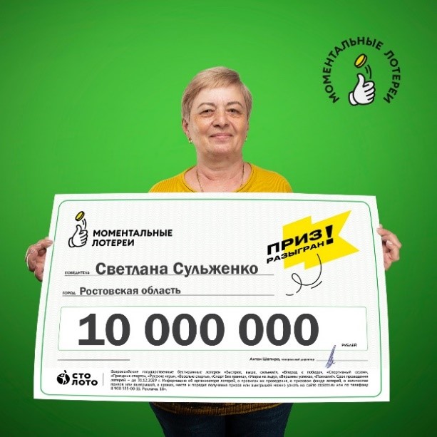 Светлане Сульженко из Ростовской области билет моментальной лотереи с дизайном «Сундук сокровищ» принёс выигрыш в размере 10 млн руб. Счастливый случай произошел с женщиной благодаря сотруднице отделения Почты России, которая и предложила купить лотерейный билет.