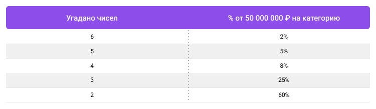 «Фраза „Распределим 50 000 000 рублей между всеми победителями. Выигрыши будут больше!“ означает, что в тираже „ВГЛ 5 Спорт“ (алгоритм определения выигрышей № 2) 24.06.2021 в 22:30 мск между победителями будет распределена указанная сумма, если до тиража и в этом тираже не будет победителей в 1-й категории».