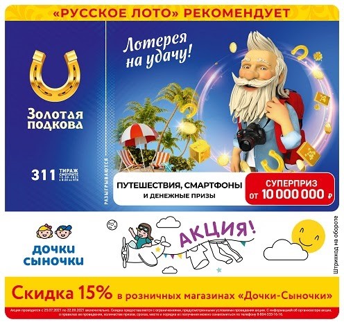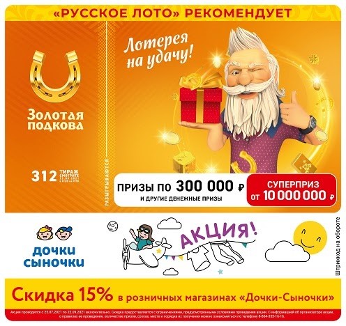 Компания «Дочки-Сыночки» и «Золотая подкова» порадуют вас выгодной акцией. При покупке от двух билетов на тиражи № 311 и № 312 «Золотой подковы» вы получите скидку 15% на товары в розничных магазинах компании «Дочки-Сыночки». Акция проводится с 25 июля по 22 сентября 2021 года. Билеты уже в продаже в розничных точках, ловите выгоду!