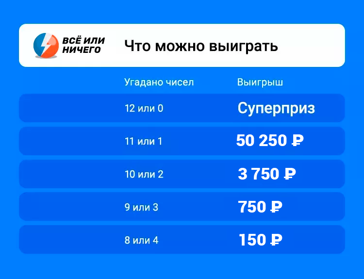 Отличная новость! Мы увеличиваем все выигрыши в лотерее «Всё или ничего». Теперь гарантированный суперприз — 7 миллионов рублей, а выигрыш за 11 или 1 угаданное число — 50 250 рублей. Попробуйте выиграть по-крупному прямо сейчас!