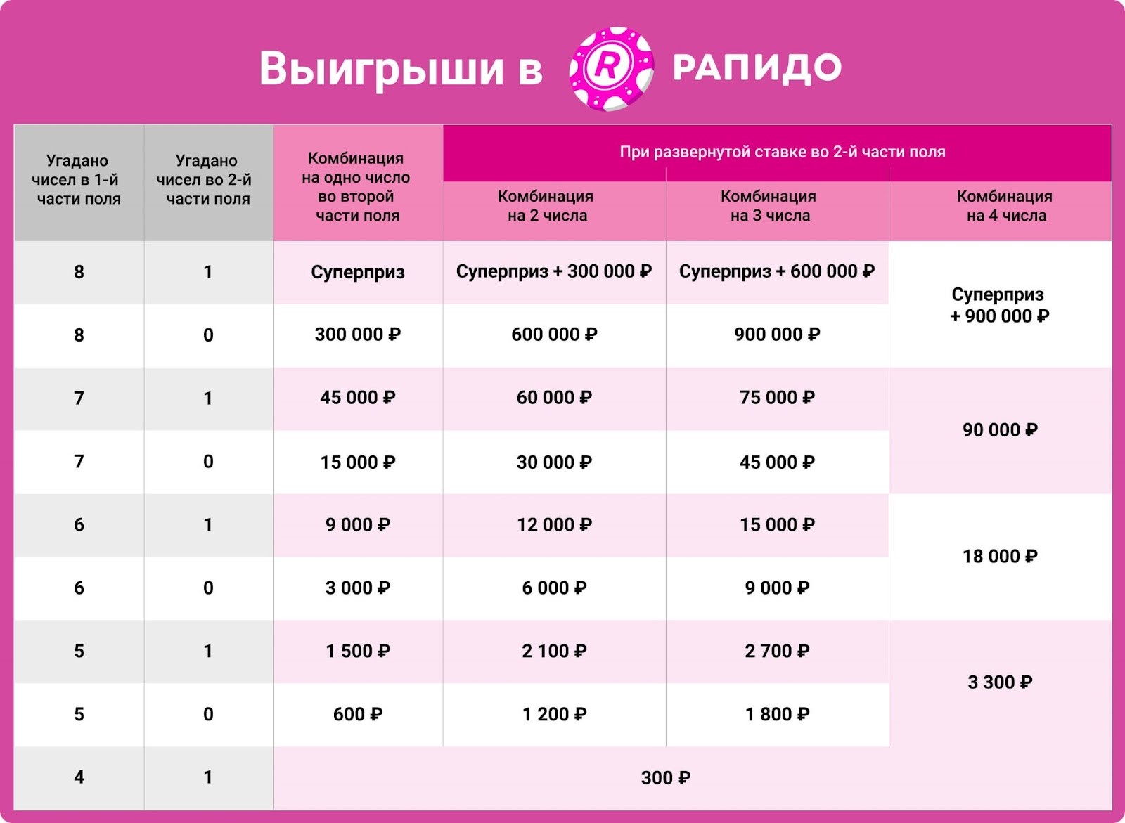 Только сегодня суперприз «Рапидо» был разыгран, а у нас снова акция с повышенными выигрышами. Гарантированный суперприз — 4 миллиона рублей, выигрыш за 8+0 угаданных чисел — 300 тысяч рублей! Спешите, время выигрывать по-крупному!