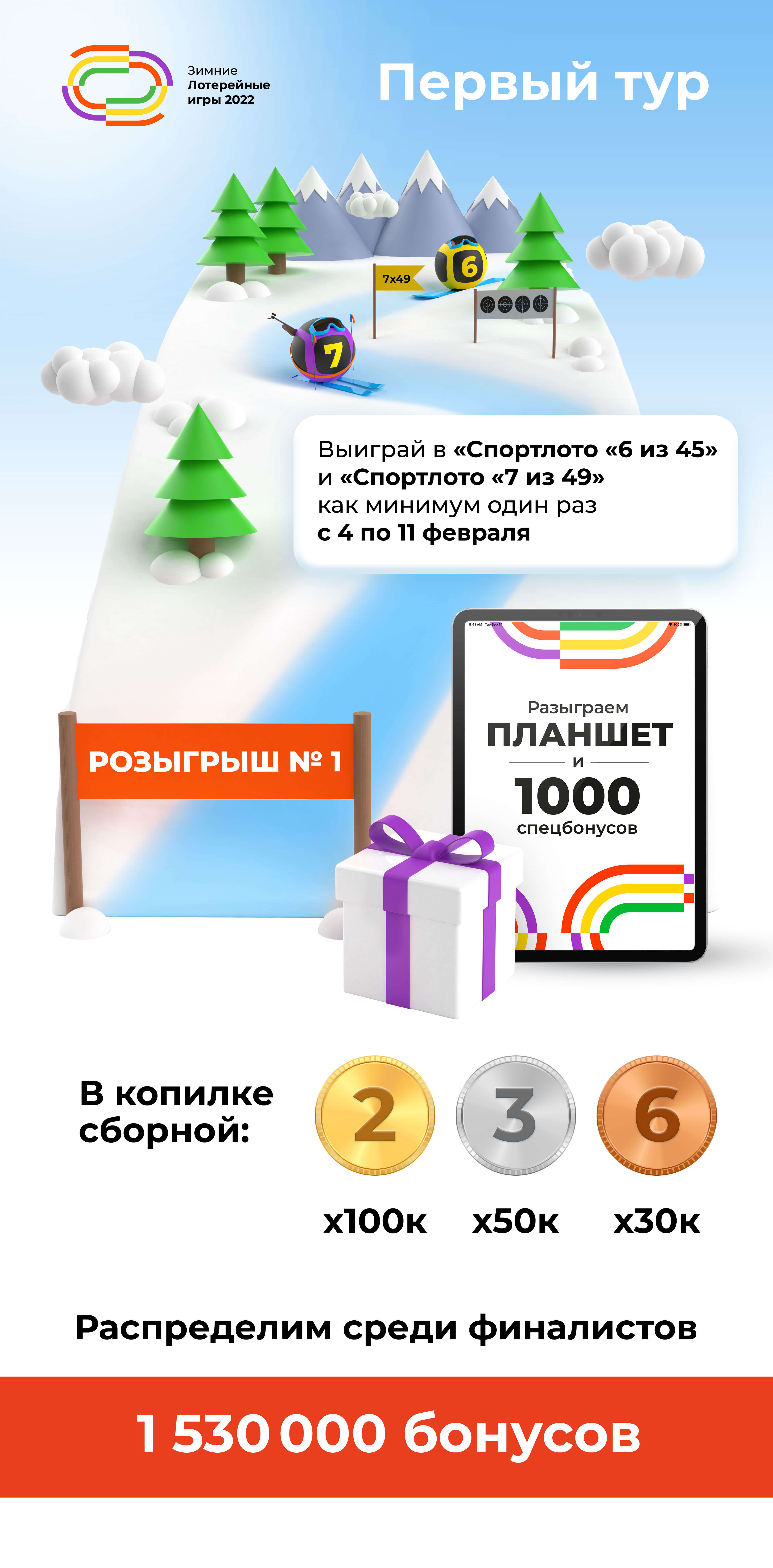 В Пекине 4 февраля началась Олимпиада, а мы запускаем «Зимние лотерейные игры». Почувствуйте себя немного спортсменами и присоединяйтесь к нашему лотерейному турниру. Вас ждут 2 увлекательных этапа и крутые призы.