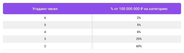 Как будут распределены 100 миллионов рублей по категориям выигрышей, смотрите в таблице.