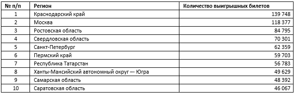 Самыми счастливыми регионами — лидерами по количеству выигрышных лотерейных билетов под брендом «Столото», проданных в сети «Магнит», — в первом полугодии 2022 года стали Краснодарский край (139 748 счастливых билетов), Москва (118 377 счастливых билетов) и Ростовская область (84 795 счастливых билетов).