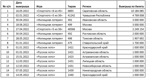 Больше всего денег по лотерейным билетам под брендом «Столото», проданным в сети «Магнит», выиграли в Москве — там совокупная сумма выигрышей по региону за полугодие составила 21 014 903 рубля. В топ-10 регионов по общей сумме выигрышей также вошли Краснодарский край (20 987 612 рублей) и Саратовская область (16 179 038 рублей).