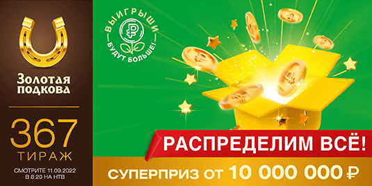 Распределение накопленного суперприза в «Золотой подкове» (распределительный тираж) состоится и выигрыши будут больше, если в тираже № 367 не будет победителей в категории «Суперприз», и накопленный суперприз на начало 367-го тиража будет составлять 3 000 000 руб. или более.