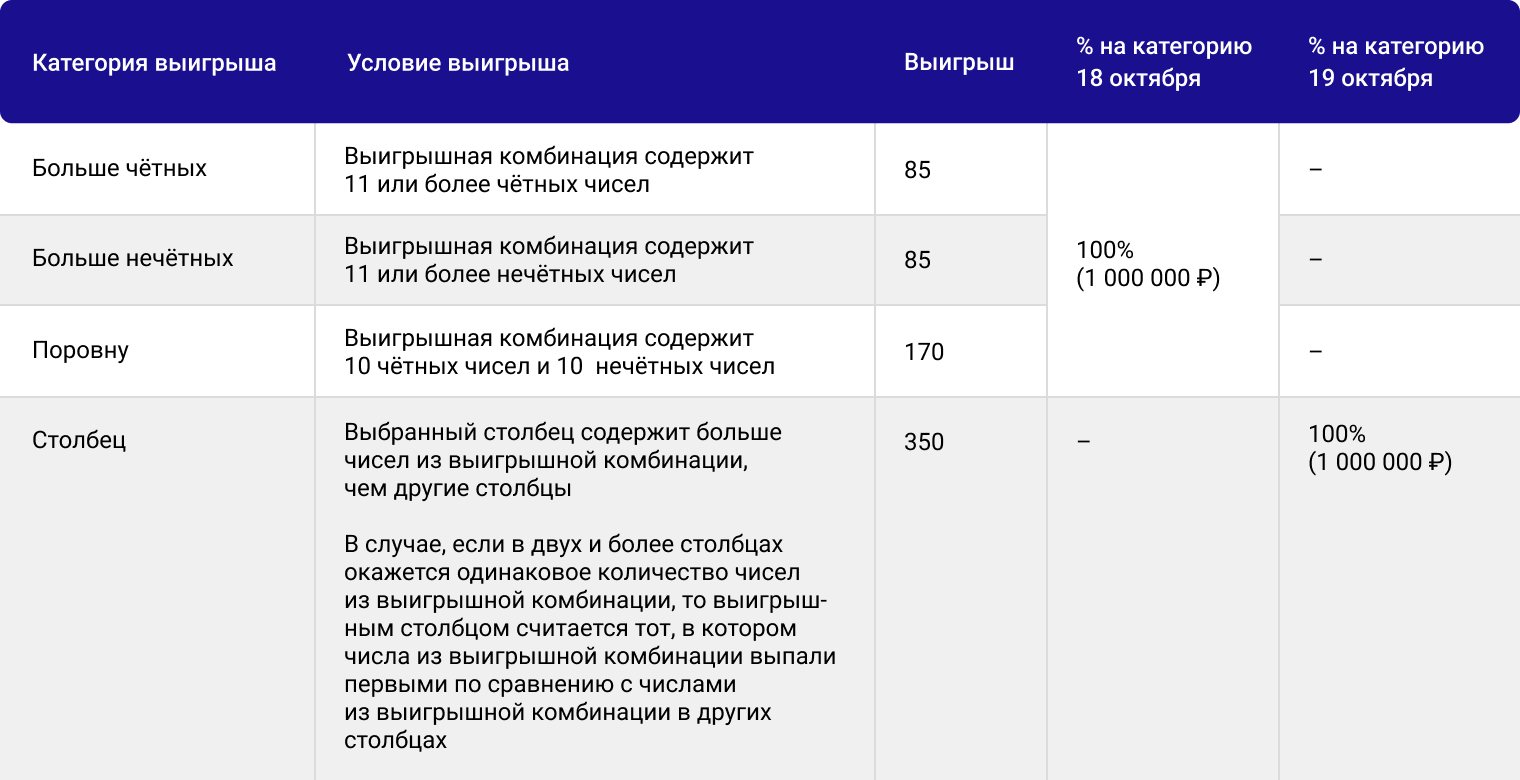 Подробности о распределении выигрышей по категориям для каждого способа игры смотрите в таблице: