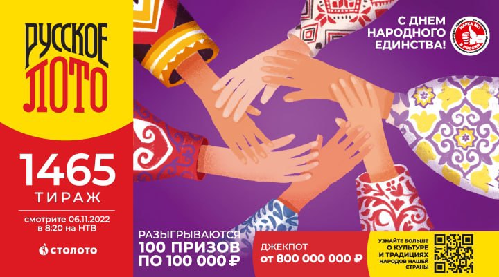 Ко Дню народного единства вас ждёт отличный тираж. В «Русском лото» разыгрываем 800 000 000 рублей и 100 призов по 100 000 рублей. Чем больше билетов купите, тем выше будут шансы на выигрыш.