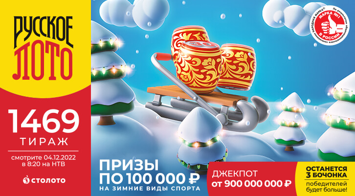 В «Русском лото» вас ждёт отличный розыгрыш! В ближайшем тираже разыгрываем Джекпот 900 миллионов рублей, призы по 100 тысяч рублей на зимние виды спорта и тысячи других денежных призов. В мешке останется три бочонка, победителей будет больше. Покупайте билеты!