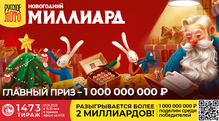 Приближается самый волшебный тираж года! Вас ждёт потрясающее шоу, любимые артисты, множество сюрпризов и денежных призов. Не упустите шанс стать миллиардером или миллионером в первый день нового года. В праздничном тираже разыгрываем более 2 000 000 000 рублей: