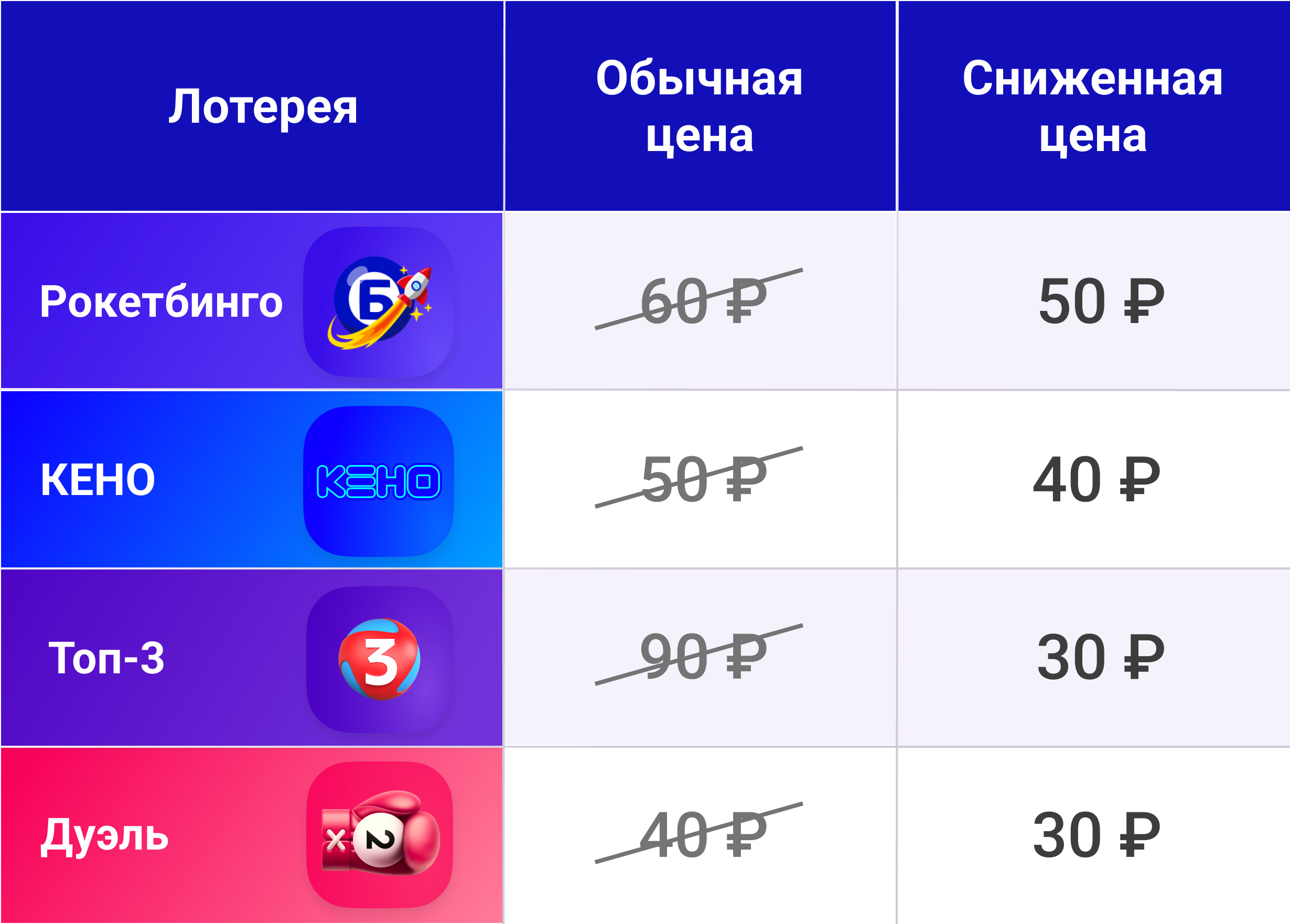 Напоминаем, что в «Рокетбинго», «Дуэли», «Топ-3» и «КЕНО» цена билетов снижена только до 8 января. Спешите испытать удачу с выгодой!