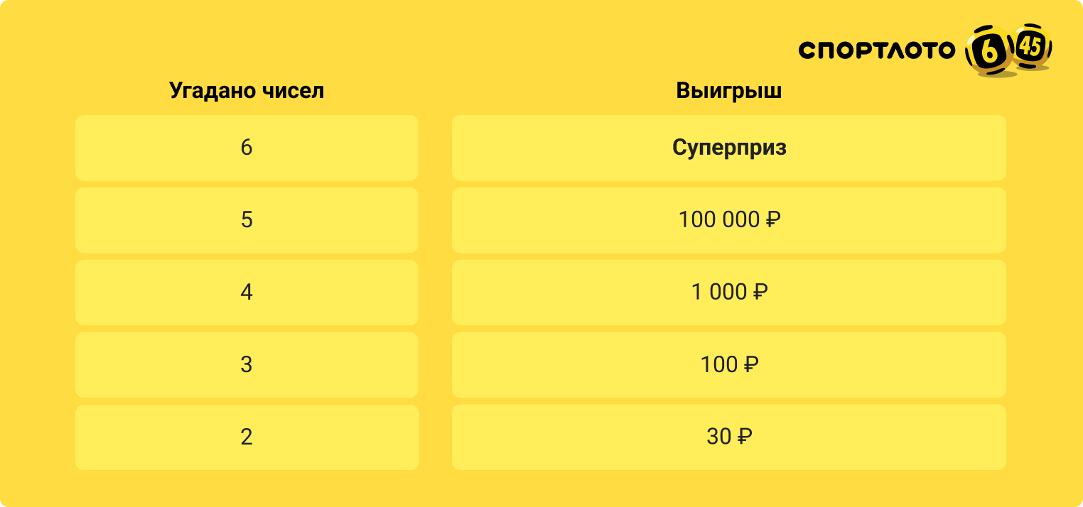 Выиграйте 100 000 рублей во второй категории «Спортлото «6 из 45»