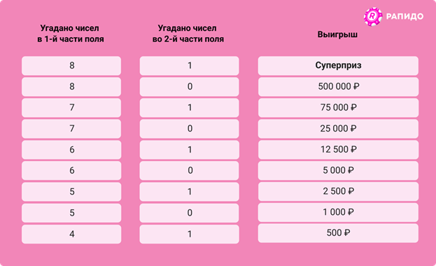 Сейчас мы поднимем вам настроение! Суперприз «Рапидо» увеличен до 10 000 000 рублей на два дня. Выигрыш за 8+0 угаданных чисел — 500 000 рублей. Покупайте билеты прямо сейчас — проводим весну вместе!