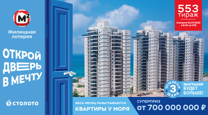 С «Жилищной лотереей» есть шанс отлично провести лето! Выиграйте квартиру у моря за 5 000 000 рублей и отдыхайте весь сезон. А ещё есть шанс забрать суперприз 700 000 000 рублей. Останется 3 шара — выигрышей будет больше. Пусть этим летом повезёт именно вам!