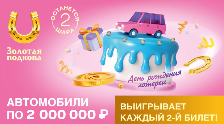 Отмечаем день рождения «Золотой подковы»! В праздничном тираже разыграем автомобили по 2 000 000 рублей и множество денежных призов. Ещё у вас будет отличный шанс выиграть многомиллионный суперприз. В день рождения лотереи выигрывает каждый второй билет. Присоединяйтесь к празднику!