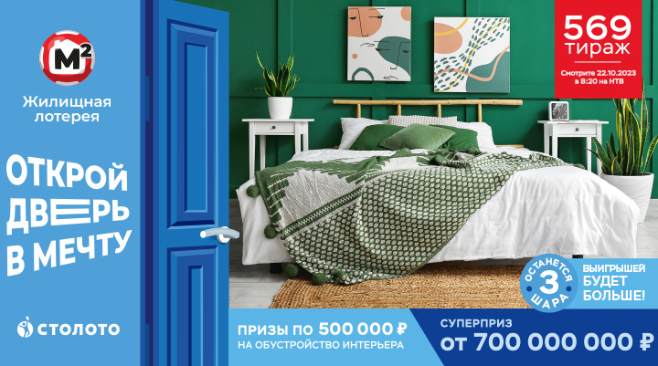 Хотите обустроить квартиру с комфортом? Тогда испытайте удачу в «Жилищной лотерее»! В 569-м тираже вас ждут призы по 500 000 ₽ на обустройство интерьера и суперприз 700 000 000 ₽. Останется 3 шара — выигрышей будет больше. Пусть удача постучится в вашу дверь!