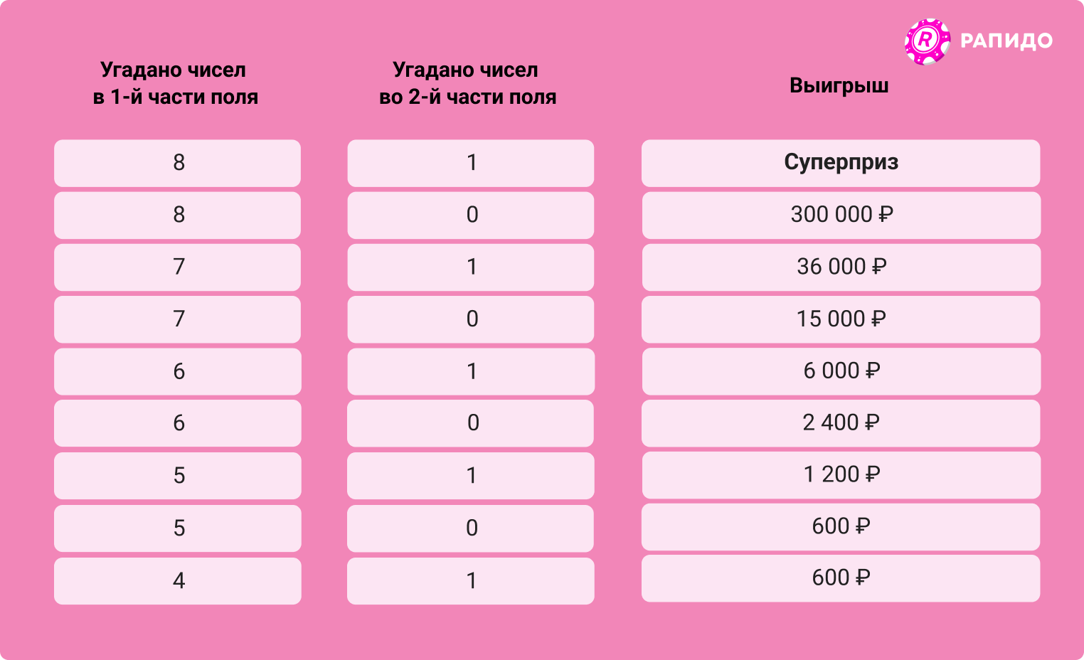 Продолжаем осыпать вас выгодными предложениями! В «Рапидо» минимальные выигрыши х2 ― от 600 рублей. Цена билета прежняя — от 300 рублей. Участвуйте в особых тиражах до 22 октября включительно, это ваш шанс выиграть больше!