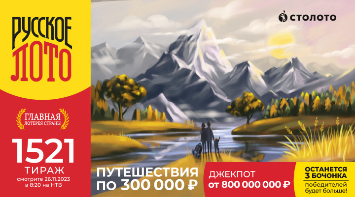 В 1521-м тираже «Русского лото» будет много интересного! Разыгрываем Джекпот 800 000 000 ₽, путешествия по 300 000 ₽ и тысячи денежных призов. В мешке останется 3 бочонка — победителей будет больше. Пусть удача будет на вашей стороне!