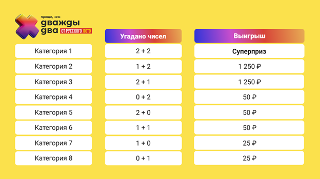 В лотерее «Проще, чем дважды два» изменилась цена участия. Теперь билеты стоят от 25 рублей. Также до 150 000 рублей увеличен минимальный гарантированный суперприз. Скорее участвуйте — в «Проще, чем дважды два» самая высокая вероятность выиграть суперприз!