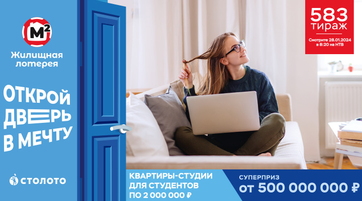 Каждый праздник — это новый повод порадовать вас особенными призами. В честь Дня студента разыгрываем студии по 2 000 000 ₽ и суперприз 500 000 000 ₽. Покупайте билеты и настраивайтесь на победу! Билеты на этот тираж в продаже с 16:15 мск 21 января до 16:15 мск 27 января. Трансляцию смотрите 28 января в 8:20 в программе «У нас выигрывают!» на НТВ.