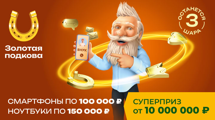 Оставайтесь на связи с родными и близкими благодаря «Золотой подкове». В ближайшие выходные разыгрываем смартфоны по 100 000 ₽ и ноутбуки по 150 000 ₽. Ещё вас ждёт суперприз от 10 000 000 ₽. В тираже выигрывает каждый 3-й билет. Удача может оказаться на вашей стороне, скорее за билетами!