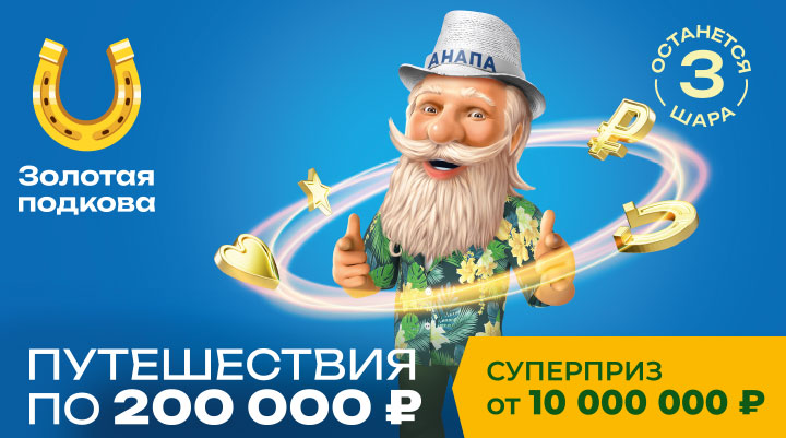 Мир вокруг такой интересный! Открывайте новые города вместе с «Золотой подковой». В ближайшем тираже разыграем путешествия по 200 000 ₽ и тысячи денежных призов. Также вас ждёт суперприз от 10 000 000 ₽. Выигрывает каждый 3-й билет. Вперёд, навстречу новым впечатлениям!