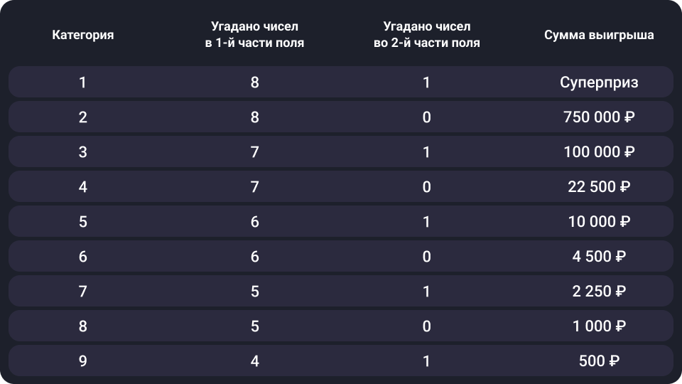 С 3 по 9 июня включительно минимальный гарантированный суперприз «Рапидо» в 2 раза больше ― 10 000 000 ₽. Все выигрыши тоже будут увеличены. Например, выигрыш за 8+0 угаданных чисел составит 750 000 ₽. Цена билета — от 500 рублей. Попробуйте выиграть прямо сейчас!