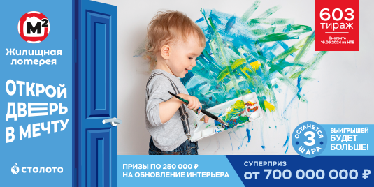 Начало лета — самое время сделать обновление в своей квартире или доме. В ближайшем тираже «Жилищной лотереи» разыгрываем суперприз 700 000 000 ₽, призы по 250 000 ₽ на обновление интерьера и другие денежные призы. В конце розыгрыша останется 3 шара — выигрывает каждый 3-й билет. Пусть ваш окажется счастливым, вперёд!