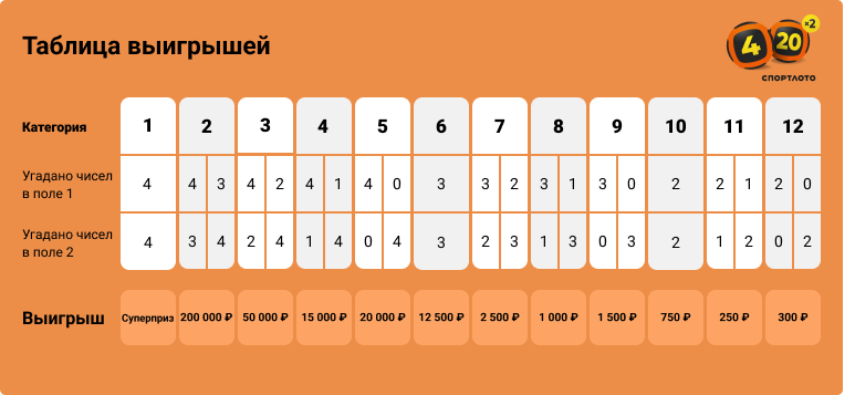 Фиксированные выигрыши в «Спортлото «4 из 20»