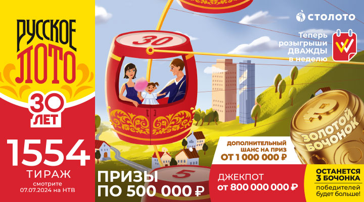 Билеты на этот тираж продаются на stoloto.ru до 17:20 мск субботы, 6 июля. Трансляцию смотрите 7 июля в 8:20 в программе «У нас выигрывают!» на НТВ.