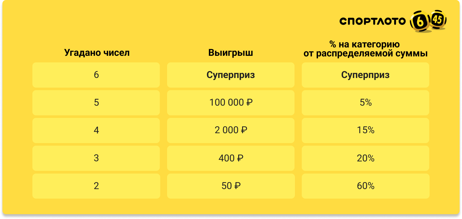 Такой розыгрыш нельзя пропустить! 14 июля в 19:30 мск пройдёт распределительный тираж в «Спортлото «6 из 45». Разделим весь накопленный суперприз между победителями. Помните, выигрыши будут больше. Увеличьте свои шансы на крупный выигрыш — покупайте больше билетов прямо сейчас!