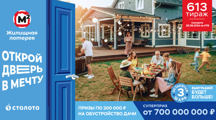 Продолжаем дачный сезон! А это значит, что в ближайшие выходные у вас есть шанс выиграть призы по 200 000 ₽ на обустройство дачи. Также в «Жилищной лотерее» вас ждут суперприз 700 000 000 ₽ и другие денежные призы. Выигрывает каждый 3-й билет. Пусть уДАЧА будет с вами!