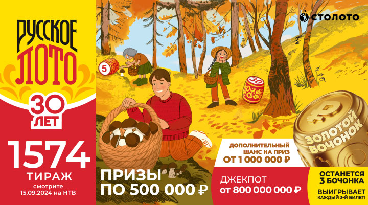 Билеты на тираж № 1574 продаются на stoloto.ru до 17:20 мск субботы, 14 сентября. Трансляцию смотрите 15 сентября в 8:20 в программе «У нас выигрывают!» на НТВ.