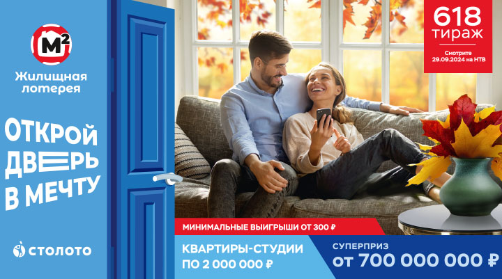 Хотите новую квартиру? Тогда не пропустите ближайший тираж «Жилищной лотереи»! Разыграем квартиры-студии по 2 000 000 ₽, а ещё суперприз от 700 000 000 ₽ и много других денежных призов. Выигрыши будут больше — от 300 ₽. Ловите момент!