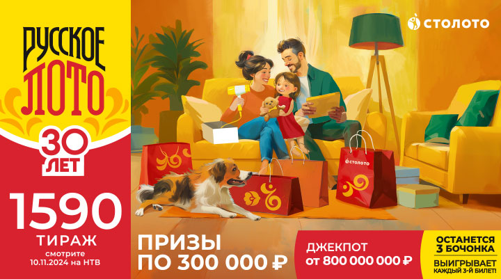 Билеты на тираж № 1590 продаются на stoloto.ru до 17:20 мск субботы, 9 ноября. Трансляцию смотрите 10 ноября в 8:20 в программе «У нас выигрывают!» на НТВ.