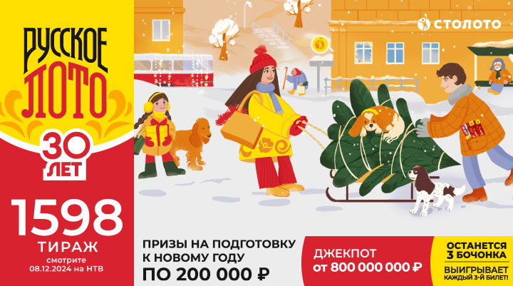 Билеты на тираж № 1598 продаются на stoloto.ru до 17:20 мск субботы, 7 декабря. Трансляцию смотрите 8 декабря в 8:20 в программе «У нас выигрывают!» на НТВ.