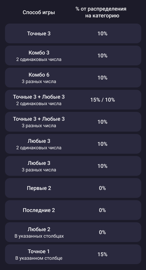 Фраза «Выигрыши будут больше!» означает, что в случае распределения части накопленного суперприза призовой фонд каждой из категорий выигрышей (за исключением первой, Первые 2 числа, Последние 2 числа, Любой порядок 2) будет увеличен за счет средств распределяемой суммы.