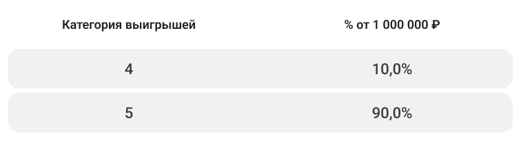 Подробнее о распределении 1 000 000 ₽ по категориям выигрышей смотрите в таблице.