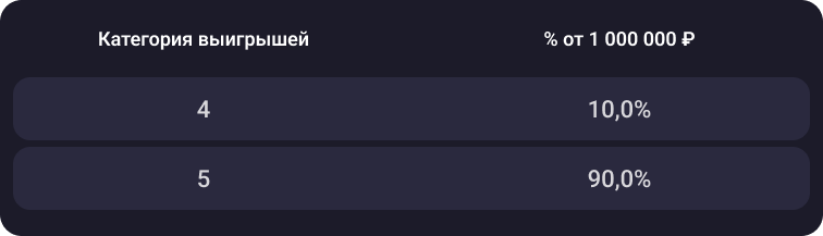 Подробнее о распределении 1 000 000 ₽ по категориям выигрышей смотрите в таблице.