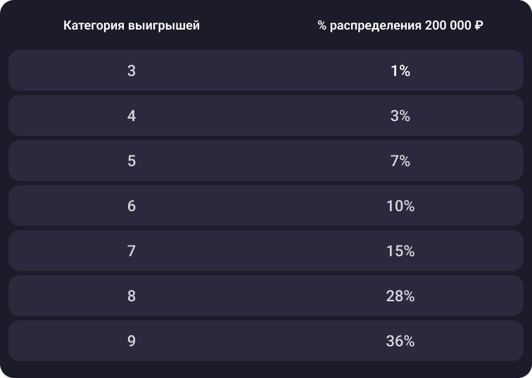 Подробнее о распределении 200 000 ₽ по категориям выигрышей смотрите в таблице.