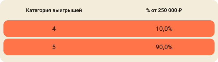 Как разыгрываются 250 000 ₽ в категориях выигрышей, смотрите в таблице.