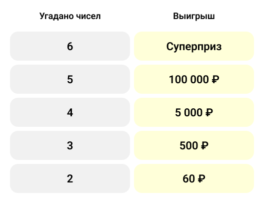 В «Спортлото «6 из 45» в 2 раза увеличили приз в 3-й категории. С 11:00 мск 12 мая за 4 угаданных числа можно выиграть сразу 5000 ₽. А суперприз лотереи уже более 42 000 000 ₽. Успейте забрать больше!