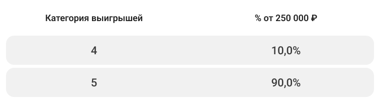 Как разыгрываются 250 000 ₽ в категориях выигрышей, смотрите в таблице.