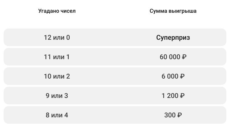 В «Забаве от Русского лото» изменилась цена билета. С 17 мая вы можете забрать суперприз от 10 000 000 ₽ за 300 ₽. Выигрыши стали больше. Угадайте 12 или 0 чисел и станьте миллионером прямо сейчас!