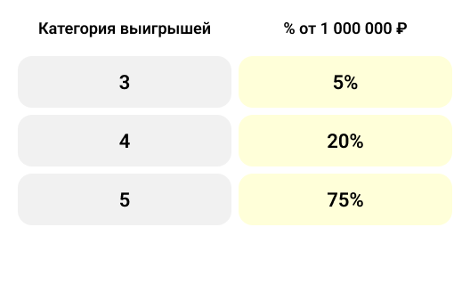 Подробнее о распределении по категориям выигрышей смотрите в таблице.