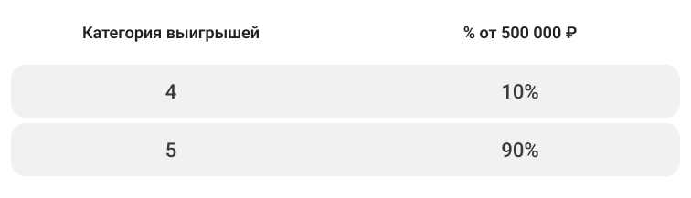 Как разыгрываются 500 000 ₽ в категориях выигрышей, смотрите в таблице.